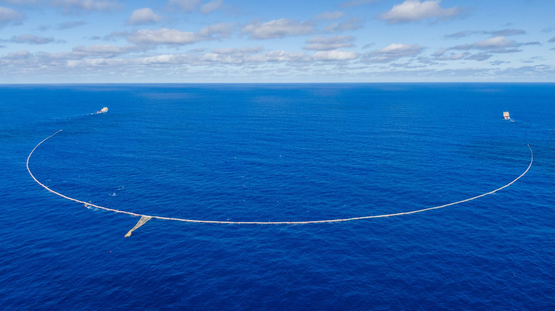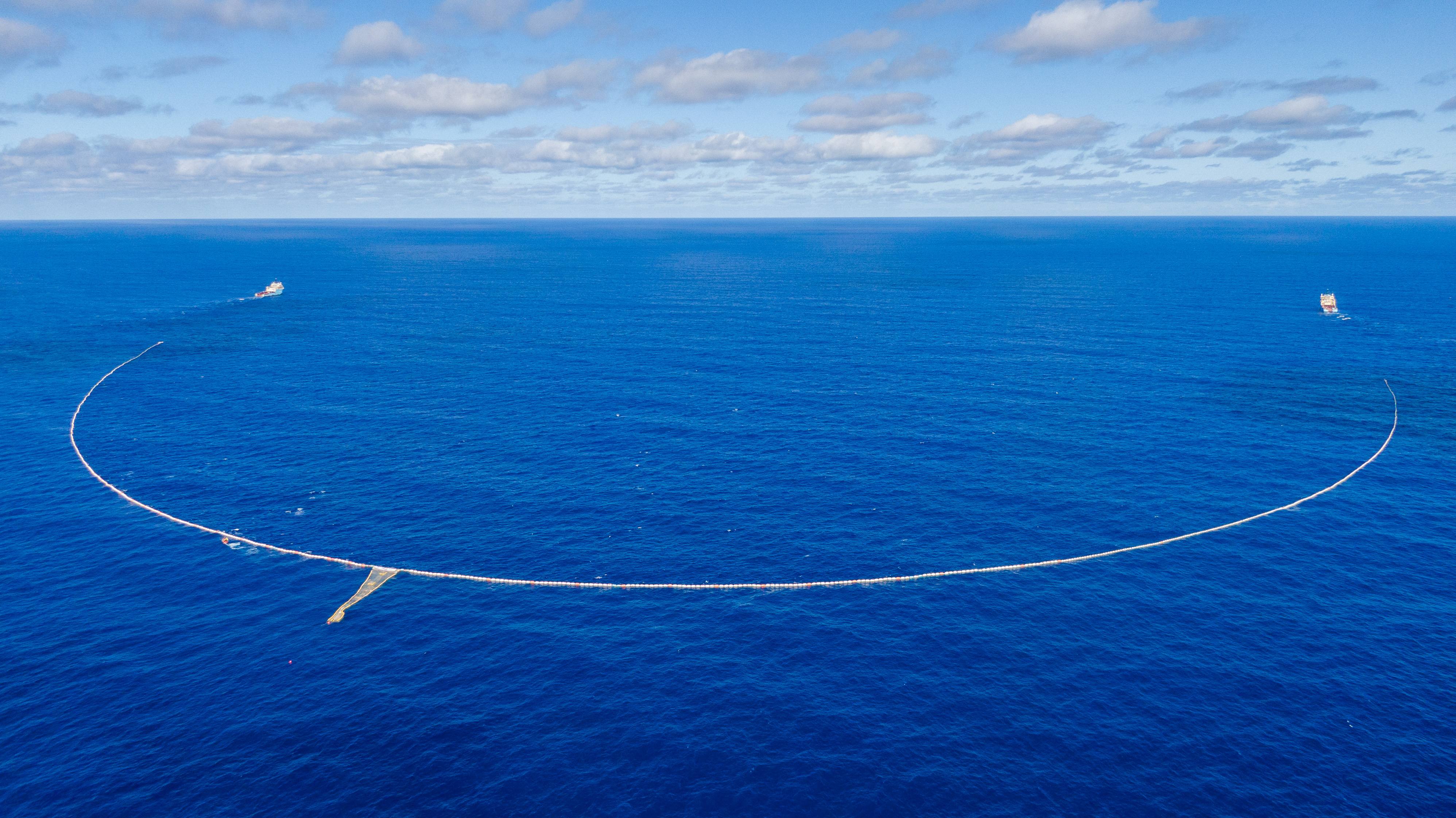 The Ocean Cleanup is cleaning up plastic in the Great Pacific Garbage Patch, the largest known accumulation zone of plastic. This patch is halfway between Hawaii and California **Pictured: System 03. The Ocean Cleanup plans to scale up to a total of 10 systems in order to effectively clean up this garbage patch** -