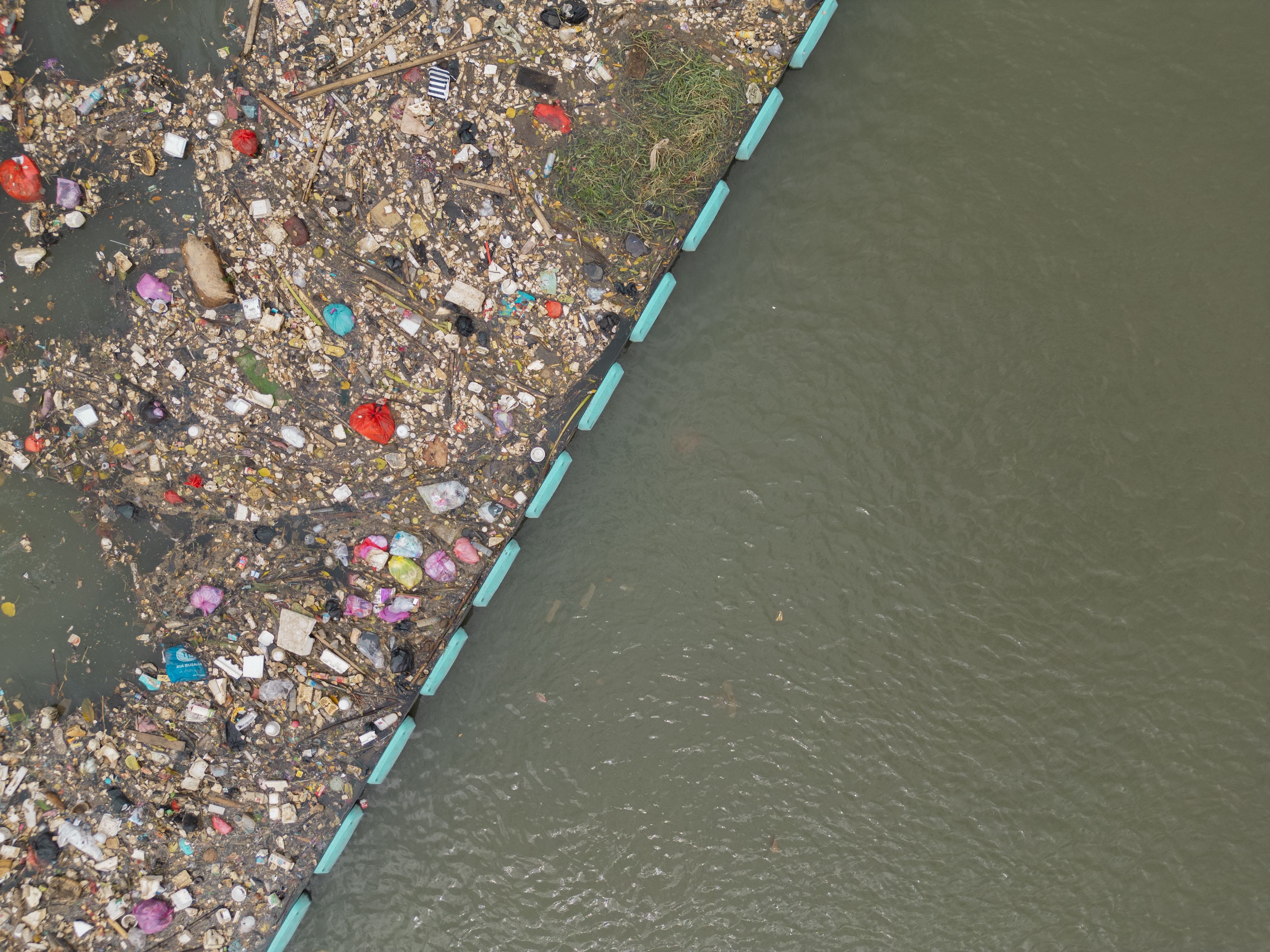 Trash accumulated against the Interceptor Barricade in Guatemala during the first flood of 2024 -